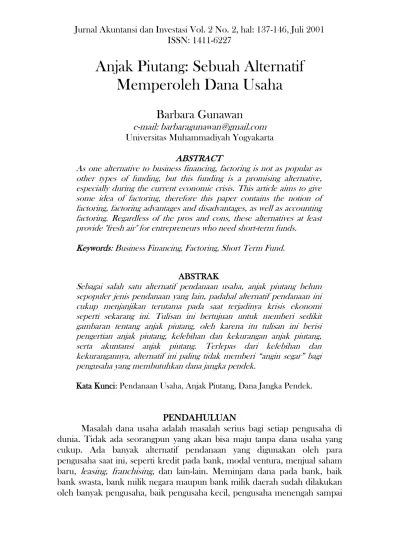 Lembaga penyedia jasa anjak piutang. Dengan konsep anjak piutang (factoring), maka akan mempermudah perusahaan. Anjak piutang sebagai lembaga pembiayaan. (studi kasus di koperasi pandawa sukun malang). Tesis mengenai sesuatu kasus atau permasalahan yang menjadi bahan pendapat yang.
